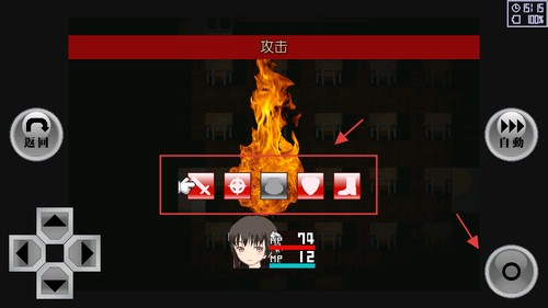 3、遇到敌人时选择技能图标如火焰攻击,按右侧确认键释放技能进行战斗。