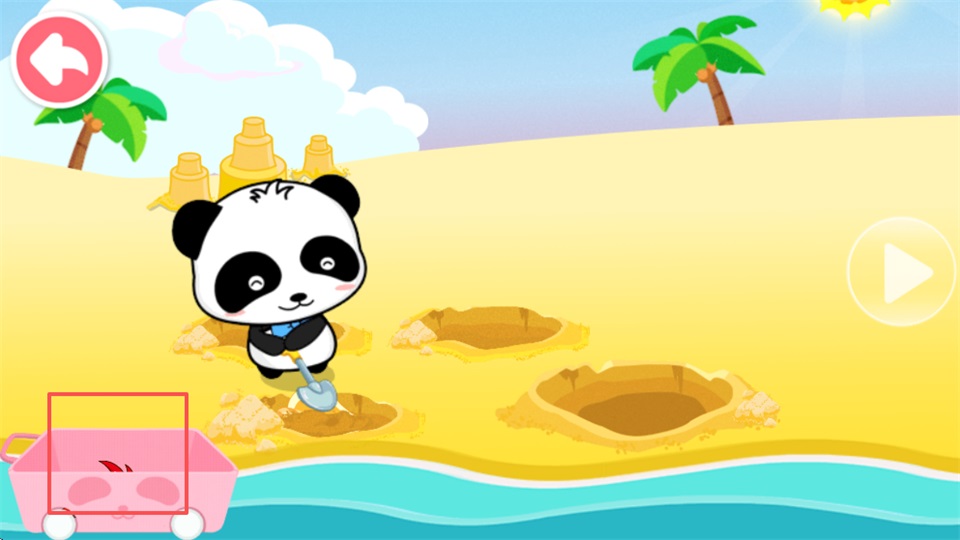 打开游戏后,孩子会来到沙滩地图,可以选择不同区域开始探索,比如沙坑、海边、礁石附近等。