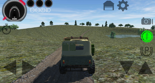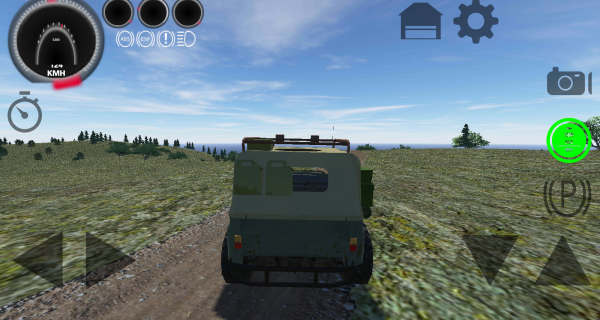 2、通过虚拟方向盘与油门刹车按键操控吉普车,在复杂山地里保持平衡与前进,小心应对打滑与侧翻。