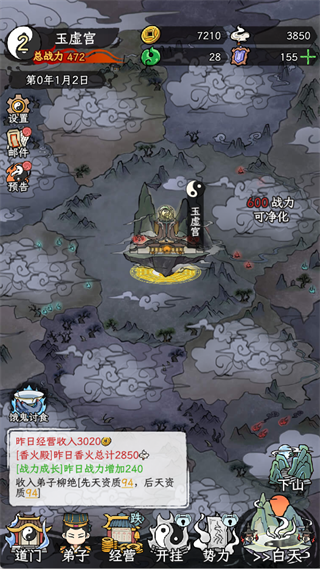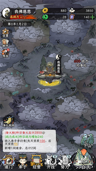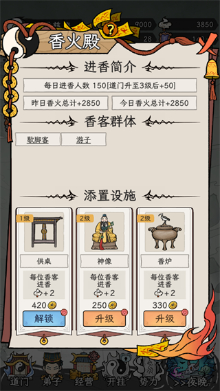 在游戏初期,铜钱和香火的资源相对有限。优先将资源分配给资质优秀的弟子。通过【开挂】、道舍、斋堂等功能的资源倾斜,迅速提升宗门核心战力,从而带动整个宗门的发展。