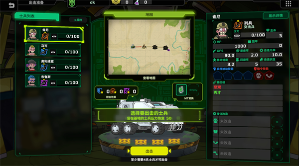 每次出击务必凑齐4名士兵,避免前线兵力不足。根据任务地图的地形与敌人类型,灵活选择兵种组合,例如面对大量空中单位时,优先选择马可、奥利维亚这类对空能力强的兵种。
