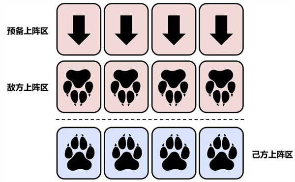 对战的战场如下图所示。每回合,你可以将任意数量的生物召唤到己方的上阵区,只要满足以下条件: