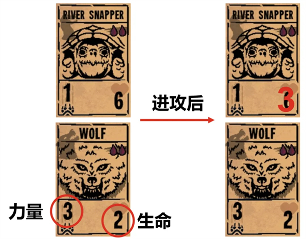 血是一种无法储存和累积的资源。例如,要上阵一只需要2血的狼,就需要即时献祭掉场上的2只动物;而如果献祭掉的是能提供3血的生物,那么多出来的1点血也无法用来支付狼之外生物的上阵成本。