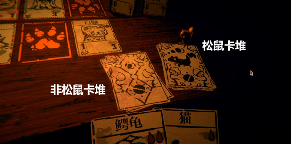 此时,聪明的你一定发现了,如果初始的4张手牌里1张松鼠牌都没有,那么你将无法上阵任何1张牌。为了避免这种尴尬的情况,你的卡堆被分成了2部分,其中1堆全是松鼠卡。