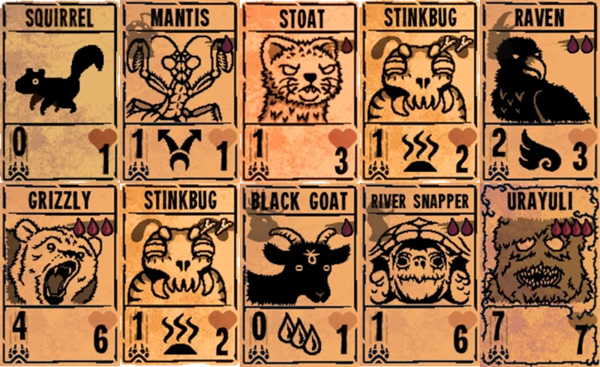 游戏中设计了大概70多张野兽牌,颇为丰富。在附录中,脑斯基将它们尽可能全地列了出来。