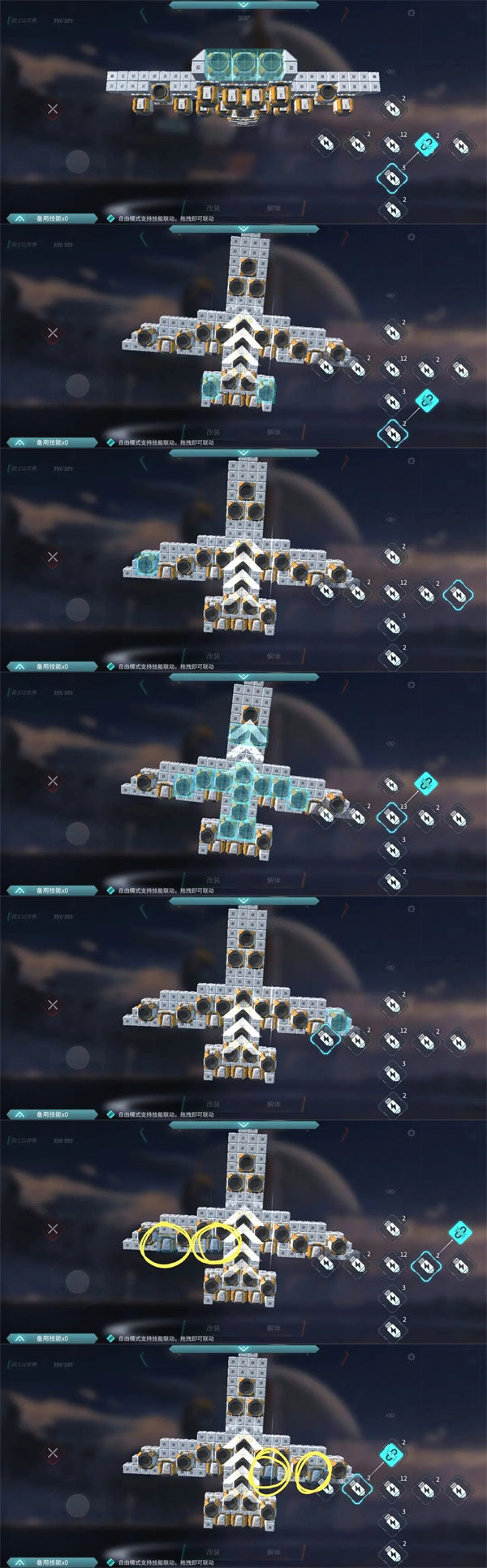 然后下面的备用技能栏里面就会出现许多按钮,每个按钮分别对应一个推进器,将他们部分合并。
