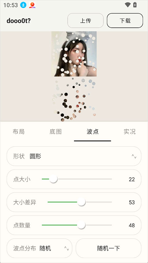 dooo0t是一款轻量纯粹的视觉创作工具,专注于波点图案的生成与艺术化打造,无需专业设计基础,即可快速创作出独具风格的波点作品,通过调整波点大小、数量、差异等参数,搭配拼贴、材质变化功能,让普通图片瞬间拥有独特艺术质感,还可浏览他人作品进行再创作,让艺术灵感不断延展,满足多样化创作需求。