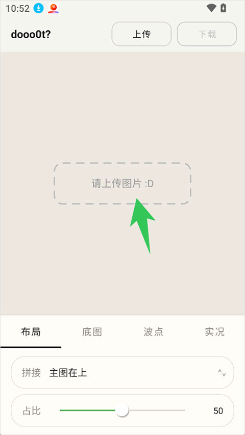 A:打开dooo0t软件,点击首页“上传图片”按钮,即可从手机相册选择人像、风景、静物等各类图片作为底图,上传后自动进入编辑界面,无需额外操作,快速开启波点创作,支持多次上传不同图片,分别进行创意加工。