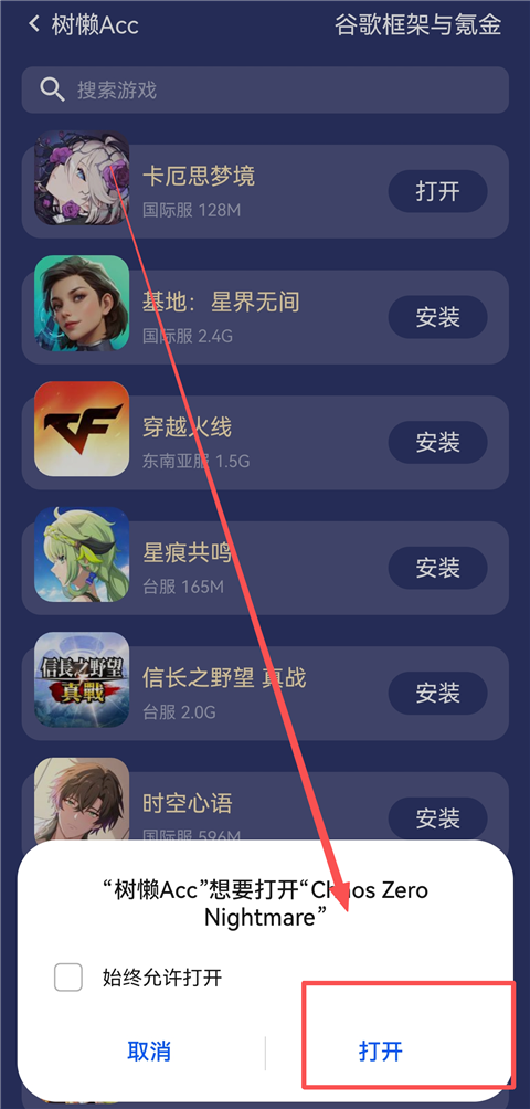 1、进入树懒Acc手游加速器软件,若需要下载外服游戏,用户可在【支持的游戏中】下载。