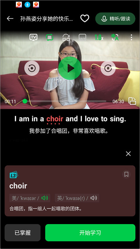 3、跟随字幕进行听力训练与跟读纠音,支持LS100学习法与影子跟读法。