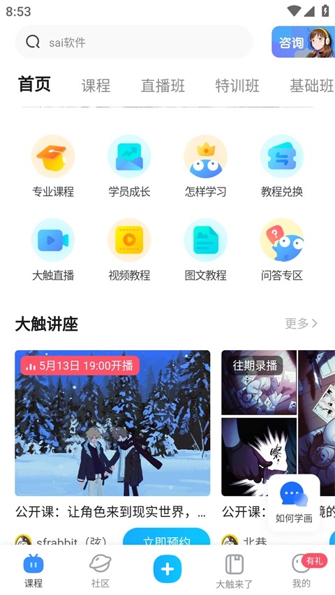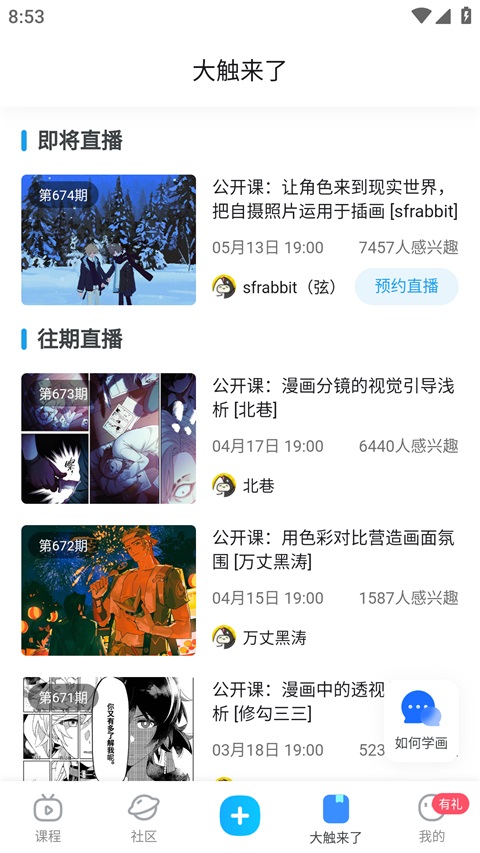 以上就是蓝铅笔App怎么预约大触直播以及观看以往大触直播课程内容!