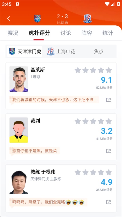 进入比赛详情页后,即可看到虎扑评分。