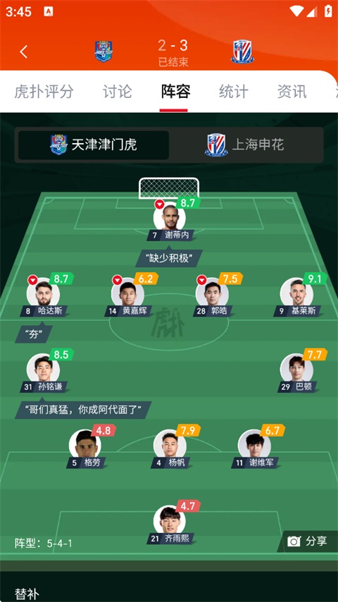 点击【阵容】,可以快速查看该场比赛所有球员的评分。
