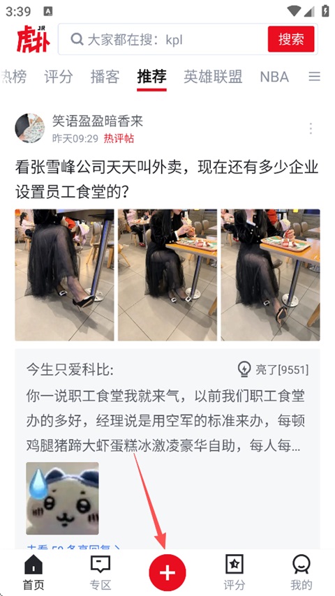 打开虎扑App,点击底部的“+”按钮。