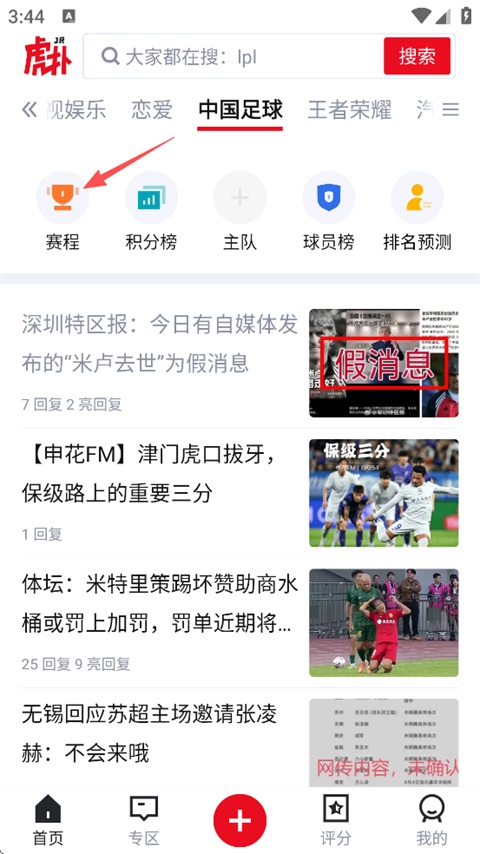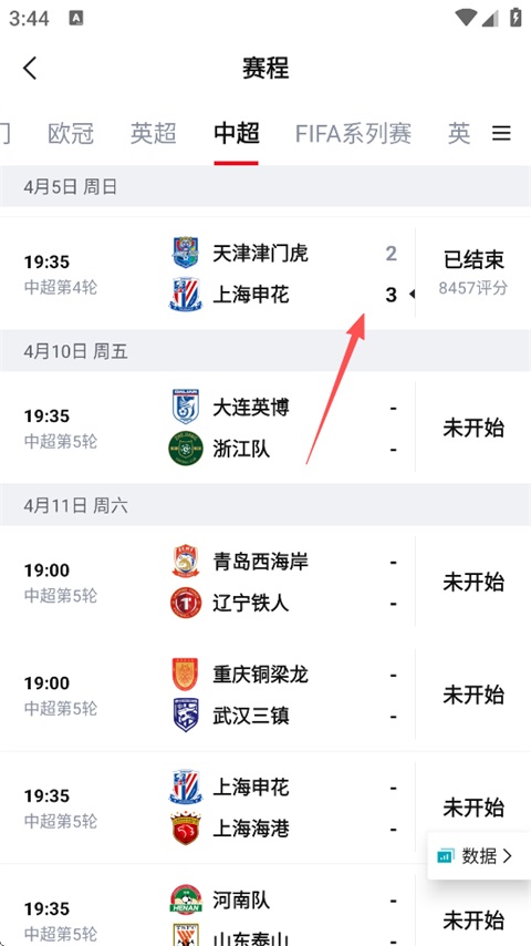 打开虎扑App,点击【赛程】,选择要查看评分的比赛(以中国足球为例)。