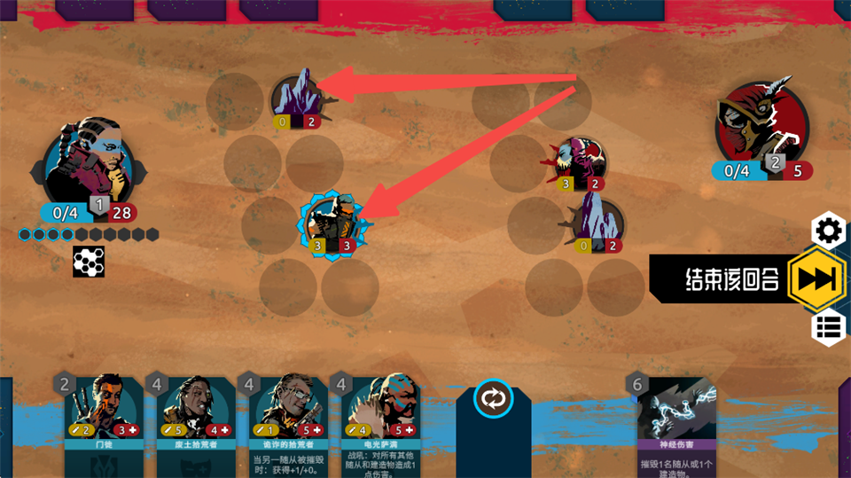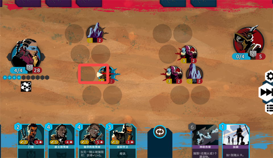 6、下回合的开始这位随从会恢复精力并能够攻击或移动,且每位随从每回合行动一次之后会进入疲惫状态。可行动者带有黄色三角的符号。