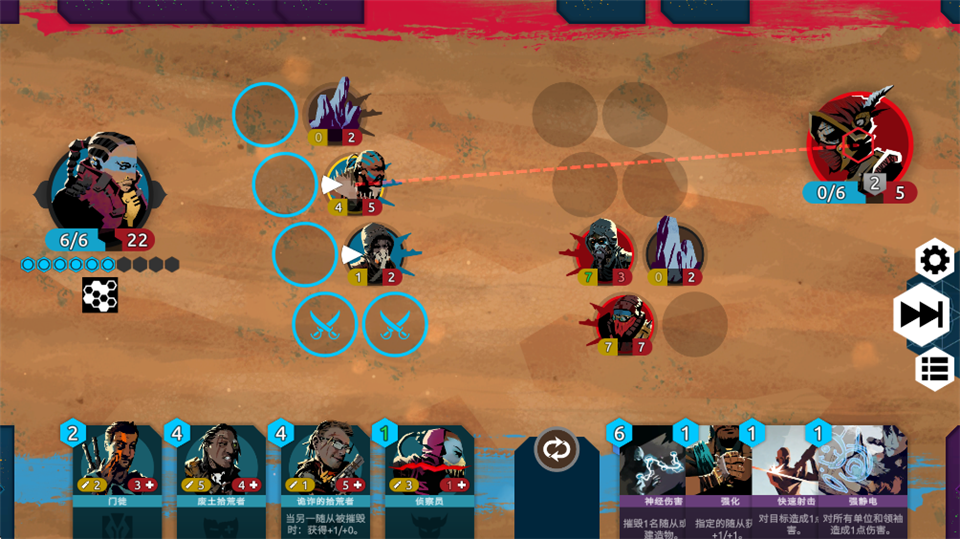 3、初期战斗可多尝试不同阵型。将具有“嘲讽”能力的单位放在前排保护后排高输出但脆弱的随从,利用战场网格的布局来限制敌人的攻击路线。