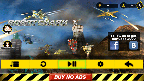 鲨鱼机器人英雄2是由Naxeex开发的一款机器人战斗游戏。游戏的场景分为陆地和海洋,在陆地以机器人姿势战斗更具有优势,但是一旦潜伏到海底还是切换到鲨鱼形态更有利于战斗。另外,鲨鱼机器人2游戏还拥有丰富的武器系统和战斗系统,在商城界面有很多的武器的可以购买,如火箭筒、步枪、机关枪等等,每个枪械的购买条件不一样,所以就需要你去接取各种任务,完成获得丰富的奖励,然后就可以肆意玩耍了。