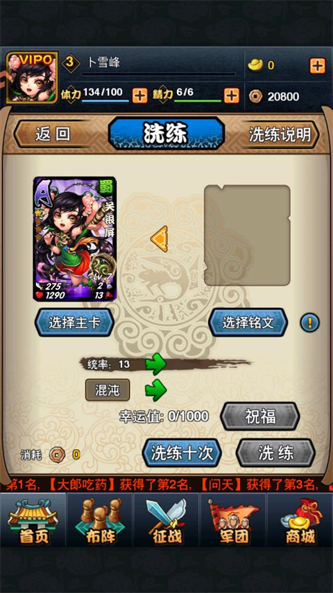 5、卡牌被洗练后统率值会随铭文技能等级增加