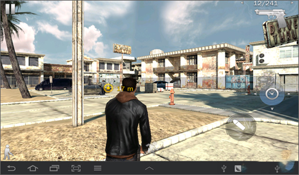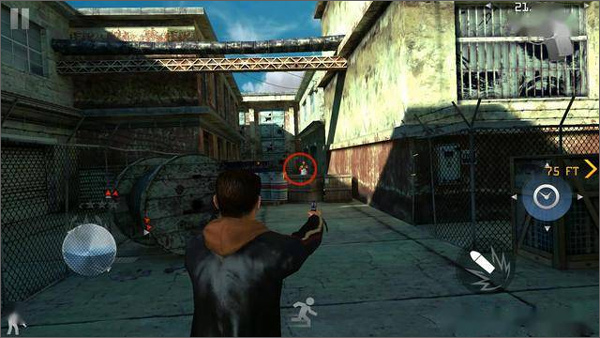 8、在游戏里面还会出现下图这样的攀爬的场面,玩家只需要控制自己的任务跳上房檐以后然后进行滑动操作,所有滑动就是左右的移动,上下滑动就是上下的移动。这个在任务模式里面有些地方会用得到。