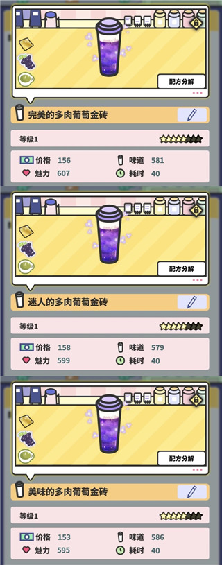 虽然不同奶茶配方的数值会有浮动变化,但是强化版配方的各项数值都要比普通配方的高(耗时除外)。一般前缀为【完美】的配方数值综合来说更好(待考证)。如下图多肉葡萄金砖配方,前缀完美/迷人/美味所对应的配方数值各有侧重。
