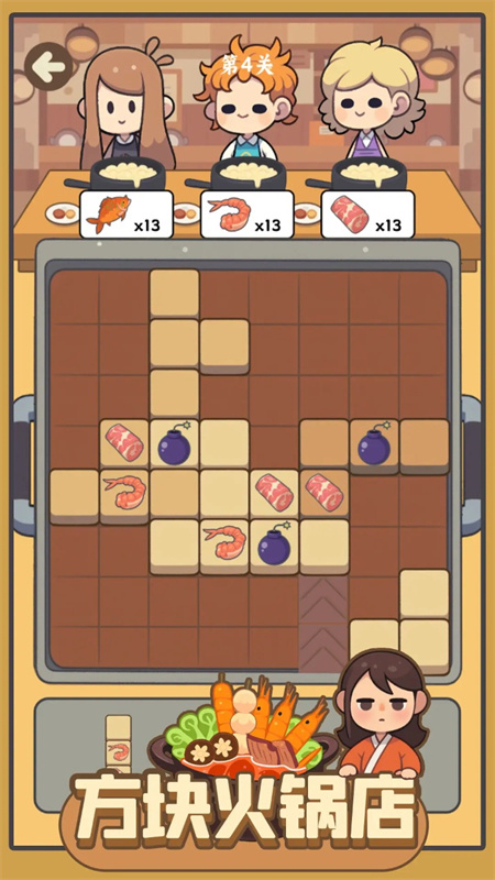 这是一款将方块消除与餐厅经营巧妙融合的休闲益智游戏。玩家需根据顾客订单,在棋盘中放置带有食材的积木块,通过横向或纵向填满整行或整列来完成消除,获取对应食材以满足点单需求。