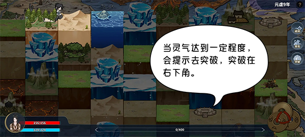 境界突破:当灵气达到一定程度,会提示去突破,突破在地图右下角。