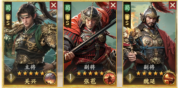 1、基础开荒队:关兴(主将)+ 张苞 + 魏延