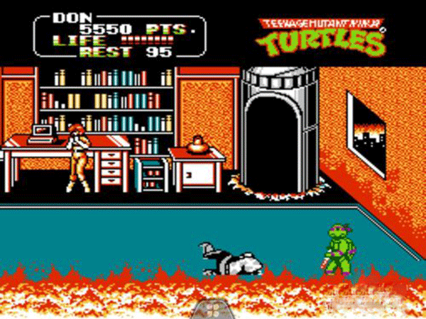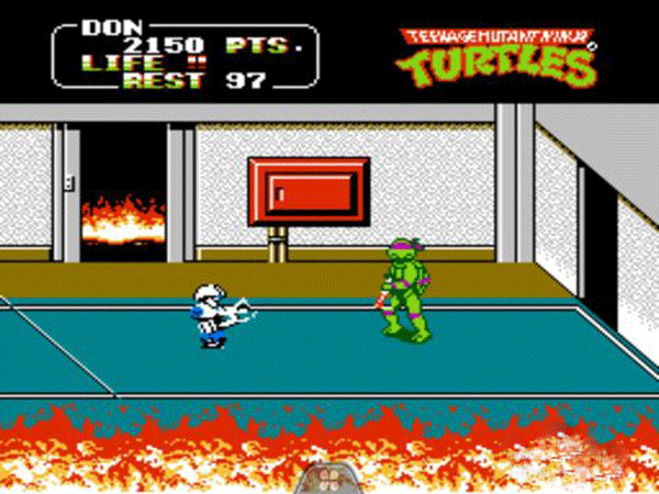 4、过关技巧:可以站在boss旁边然后使用普通攻击,boss在被攻击时不会攻击忍者龟,不过要注意躲避boss的子弹,一般失去两条性命就可以过关了。