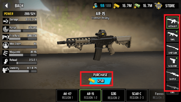 2、点击左侧的“WEAPONS”,选择想要使用的武器,右侧是枪的类型,左侧可以看到相关的数值。