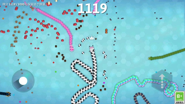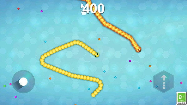 2、左侧滑轮控制你的小蛇移动,右侧控制加速,收集场景中的小光球获得等级。