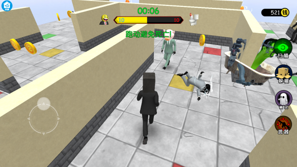 2、进入关卡中,使用轮盘来移动角色,躲避变异人的攻击,远离他们。