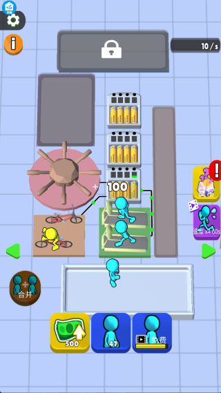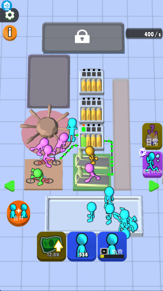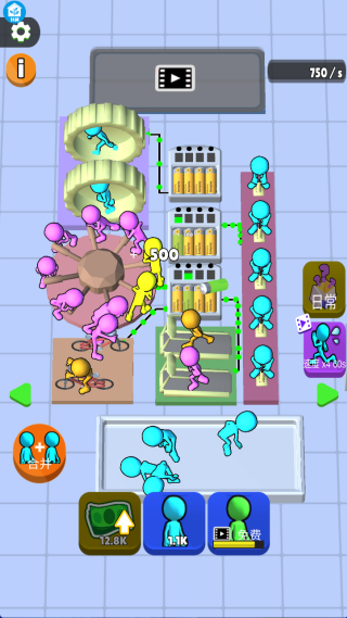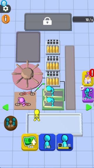 2、在各种机器上进行工作,招募的小人相同颜色可以进行合并升级。