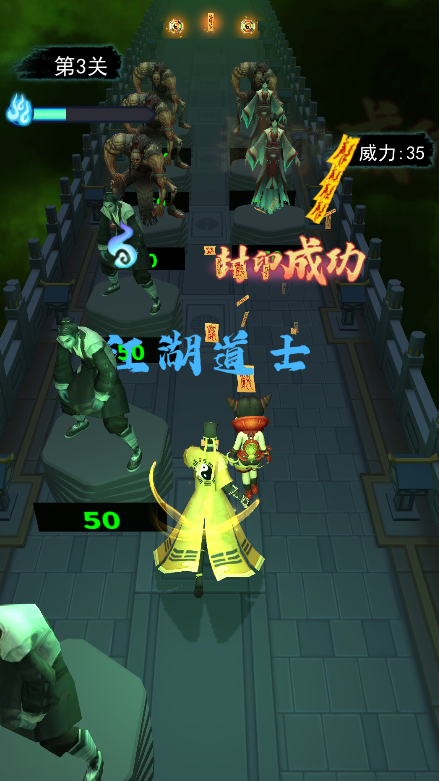 2、设有自动攻击的放置操作,基本上没有任何的操作难度,更多的是考验玩家的手速和反应里。在关卡的竞速跑酷类玩法中,有各种各样的“buff”效果,撞击即可获得buff加成,提升道士的战力。