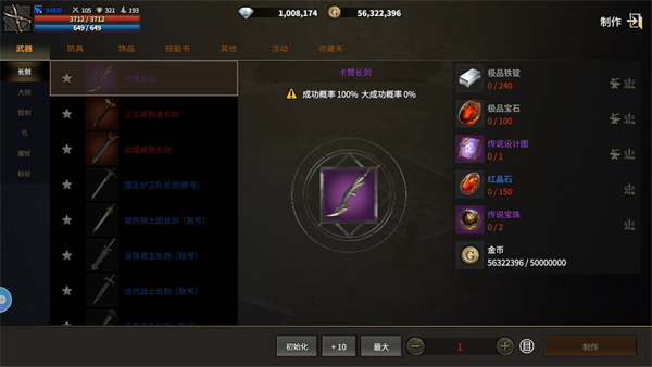 游戏右上角主菜单中选择“制作”选项,就可以制作武器、护甲、饰品、技能书等各种物品。点击每件想要制作的物品,可以查看制作该物品所需的“材料”及“数量”;制作道具材料都可以在游戏中获得。