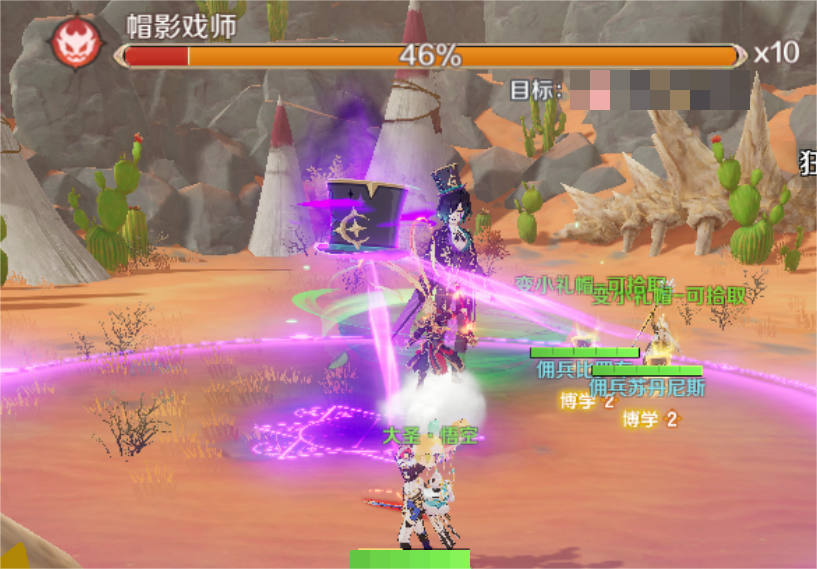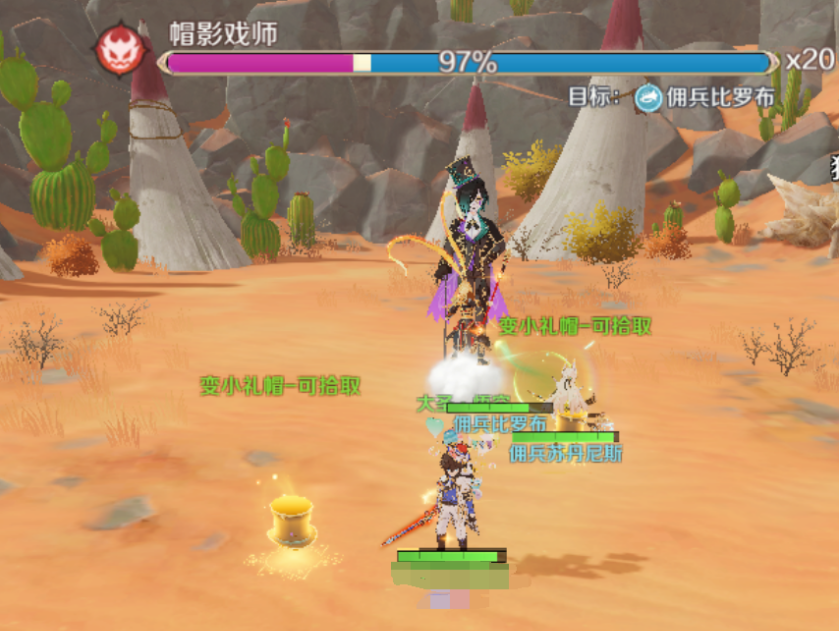 BOSS释放两顶魔术帽子造成伤害同时会变小,留下变小礼帽,拾取“变小礼帽”对BOSS使用,会使BOSS变小、攻击力下降;