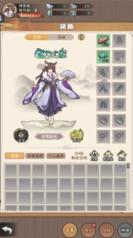2、点击角色按钮能使用不同的装备,还可以对角色的装备和技能进行强化,以及装备神通。
