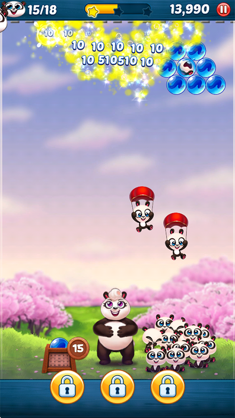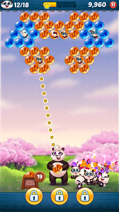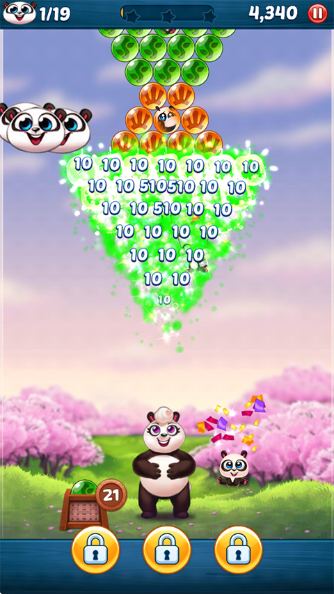 熊猫泡泡龙(Panda Pop)是将泡泡龙消除玩法和熊猫元素结合的一款手游,在这里玩家可以控制画面下方的发射台开始挑战,发射颜色不同的小球,只需要与相同颜色的球碰撞就能完成消除,还可以尝试触发一些具有特殊效果的珠子,最终成功的将被困在泡泡中的熊猫宝宝救下来就能完成闯关。