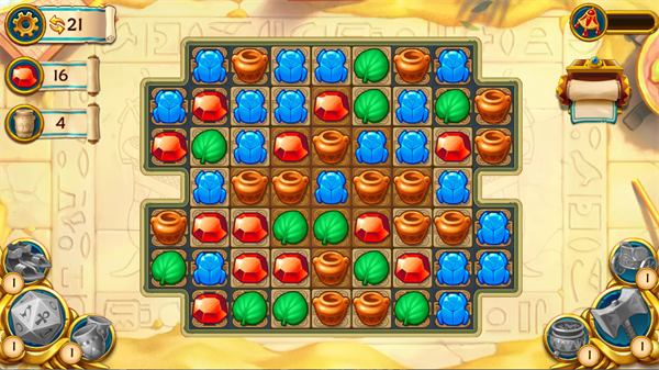 埃及的珠宝(Jewels of Egypt)是结合了三消和建设等玩法的一款手游,这款游戏以历史中的古埃及为背景,在这里玩家可以化身为一位建筑师,需要在经典的三消规则下开始挑战,通过消除相同颜色的物品来获得奖励,积攒足够的材料之后就能尝试重建被毁的聚居地,复兴埃及王朝的荣光。