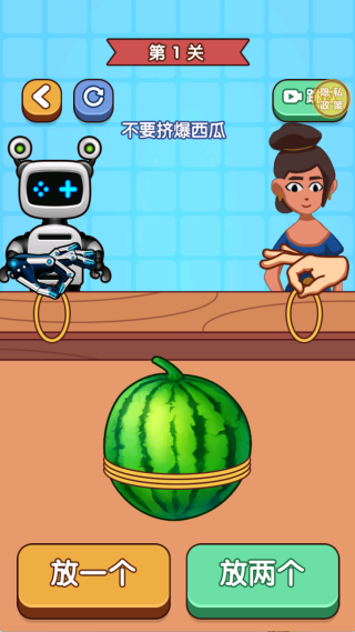 3、挤爆西瓜玩法中,你需要与机器人进行比拼,每次决定放几个绳圈。