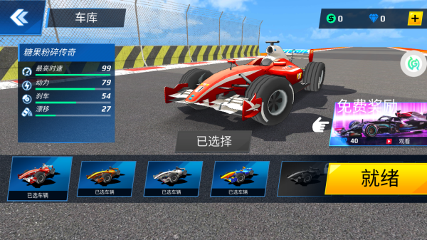 4、车库中涵盖超多款F1赛车,每款车辆的时速动力属性都不相同。