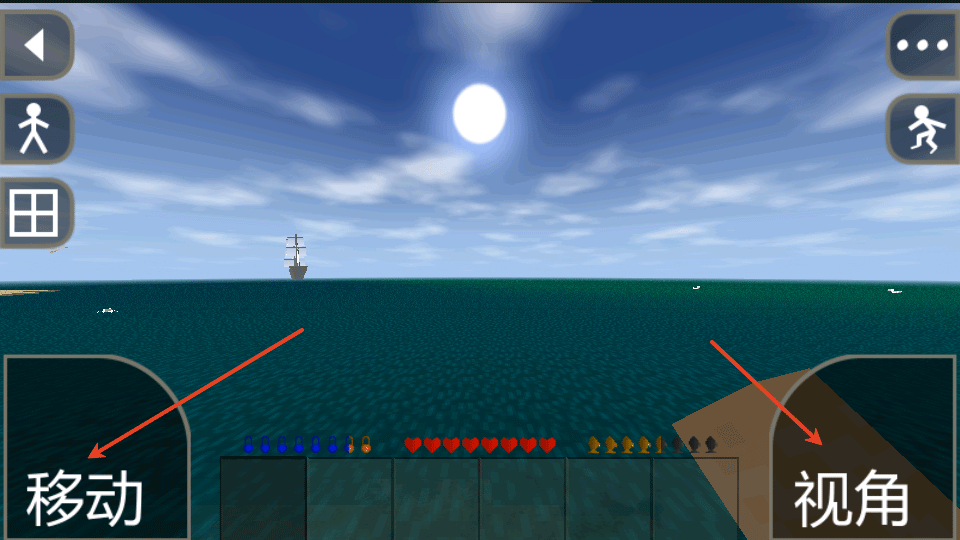 6、左下角可以控制移动,右下角控制视角,还血条,你需要注意血条并生存下来;