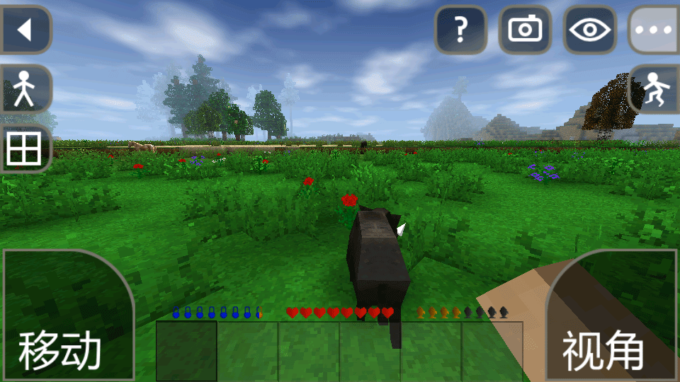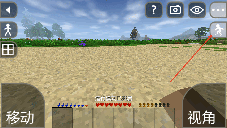 10、屏幕右上角的省略号按钮“…”用来查看更多功能,问号按钮是帮助,眼睛按钮用来切换视角,可以切换第一人称或第三人称。相机按钮用来截屏。