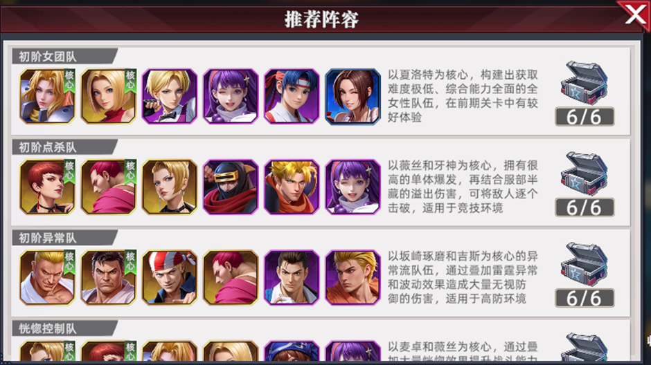 推荐搭配:大蛇 + 草薙京 + 八神庵 + 夏洛特 + 玛丽 + 夏尔米