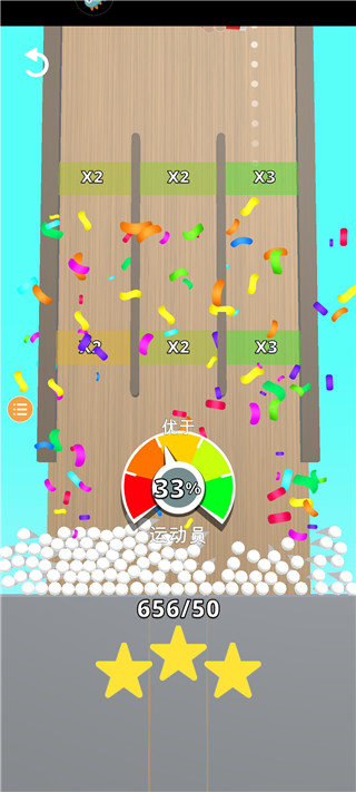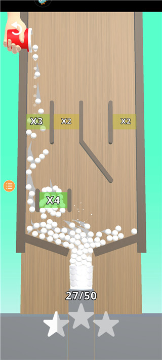没有任何难度,玩家只需要点击屏幕移动到指定的通道即可,小球会在遵循物理特性下落的过程中会自动经过翻倍杠杆从而生成大量的弹跳球,通过杯子将这些小球接住,完成关卡。