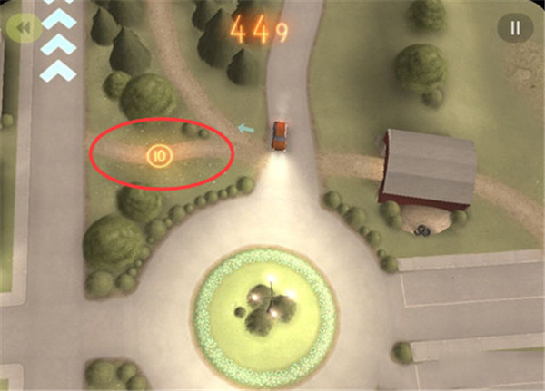 6、游戏中开车的时候会看见地上有圆圈中写着10和圆圈中写着20的图标,那个是分数,在不会撞车的情况下,最好还是吃一下。