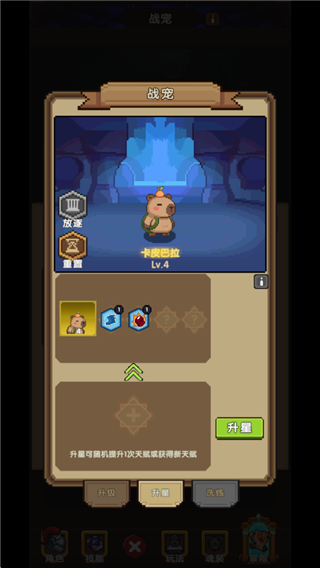 3、重复获得的宠物可以进行升星,升星会提升宠物的属性加成和天赋技能,升星选择高星级的宠物作为材料,会额外提升其对应的星级。若额外星级超过当前升星上限,额外的星级不会生效。