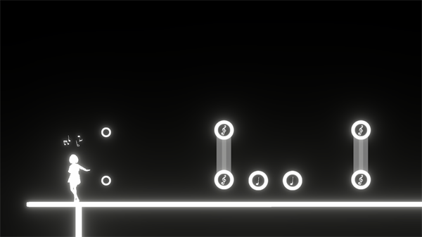 第二关是喵斯式的横版,玩家需要根据音符的节奏来进行点击,点击右边屏幕可以接取下面音符,点击左边屏幕可以接取上面音符,音乐结束后就能进入下一关。
