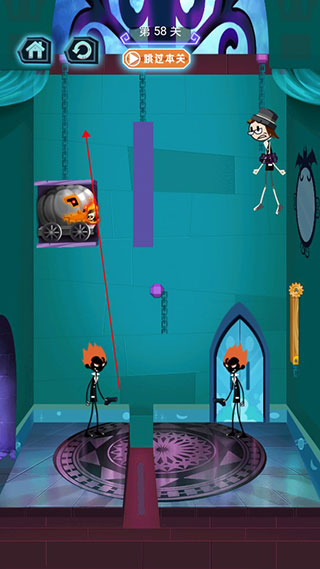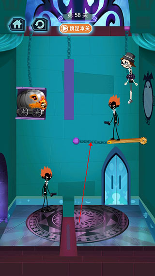 2、完成上一步后,割断最左侧的绳子,使其自动触发机关,击落第一个掉落的火柴人。