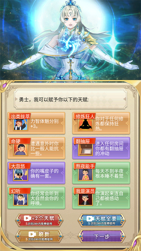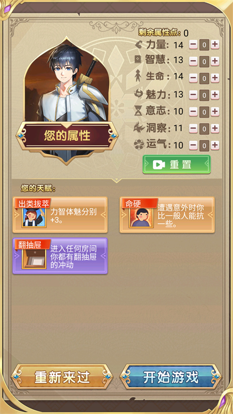 3、选择三个初始天赋,可直接影响后续的游戏体验和角色发展路径